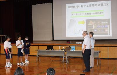 薬物使用を勧められた時の断り方について、代表生徒による実演を交えながら学ぶことができました。