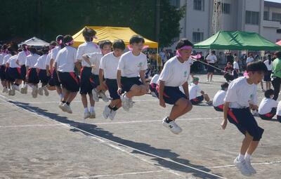 1年生は学年種目で大長縄を行いました。息を合わせて精一杯縄を跳ぼうとする姿や、