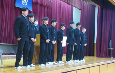 表彰集会では、吹奏楽部・女子バレー部・美術部・駅伝強化部が表彰を受けました。